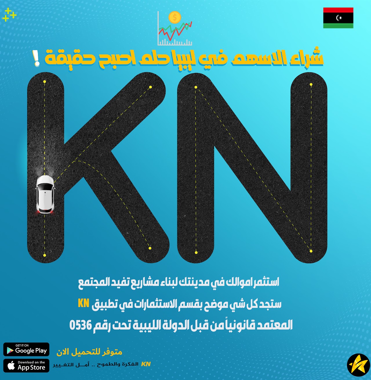 ان تطبيق KN يقدم فرصة استثمارية وتجارية مثيرة للاهتمام لجميع شرائح المجتمع، اذ يتميز قسم "الاستثمارات" في التطبيق بأنه القسم الذي يوفر فرصة حقيقية للمشاركة بنظام تساهمي في المشاريع التجارية الخاصة، بالاضافة الى الاستثمار في المشاريع القائمة على ارض الواقع ودعمها لإسكمالها، اذ يعد هذا القسم فرصة رائعة للمستثمرين المحتملين للمشاركة في تنمية وتطوير مدنهم بشكل سهل ومباشر، كما يفتح هذا القسم أبوابًا واسعة لأصحاب الأفكار التنموية والاقتصادية الحريصين على النهوض بمدنهم وتطويرها، لتقديم برامج مصغرة لمشاريعهم وأفكارهم التي يتطلعون لتحويلها إلى واقع ملموس على الارض، ويشمل ذلك خطط وافكار الشركات والمؤسسات المحلية ايضاً.